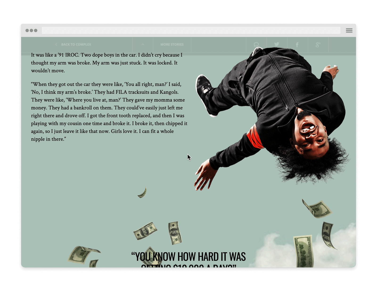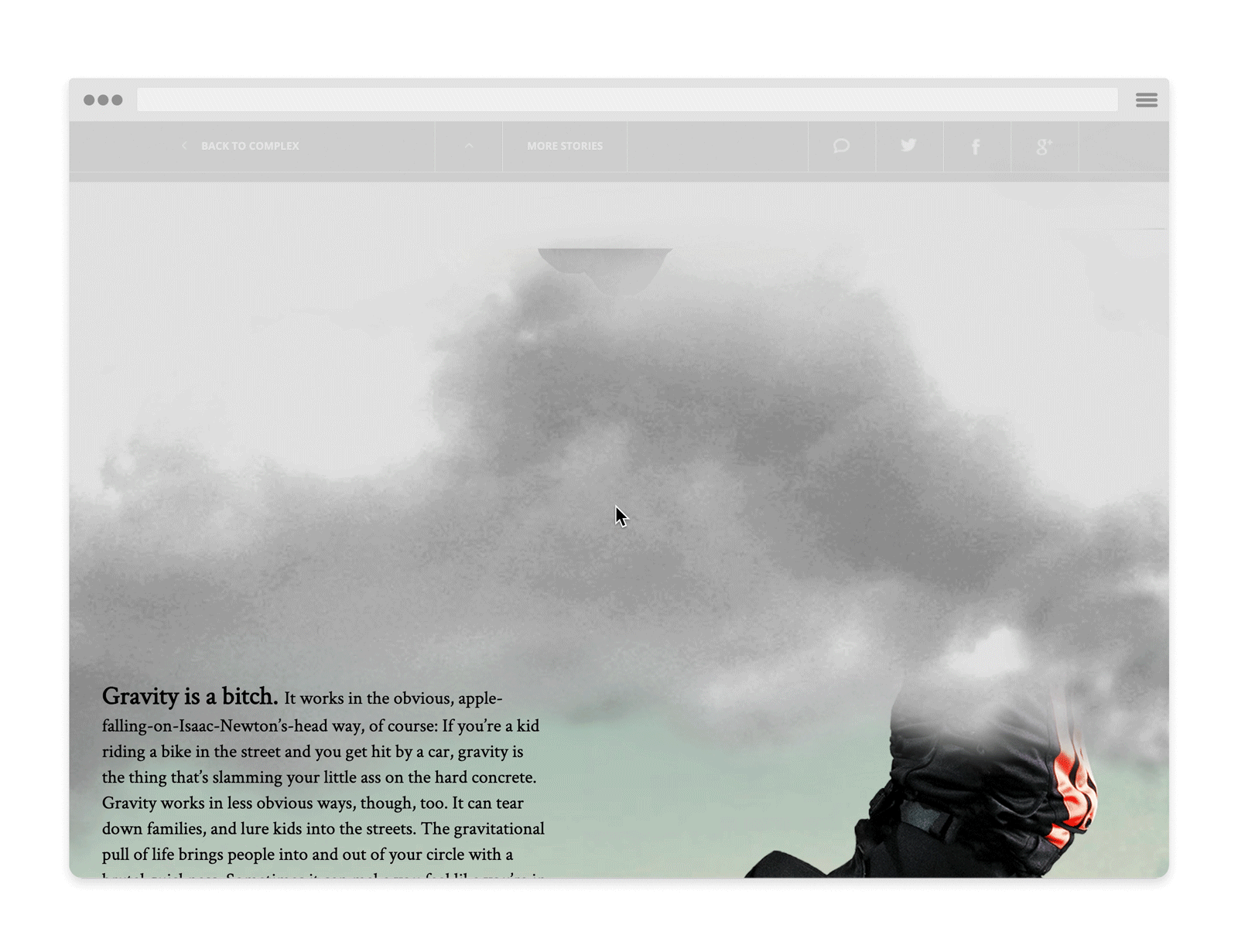 Assisted in storyboarding, image selection, image comp and layer separations to execute the immersive parallax web article, which animates as the reader scrolls through the article.
