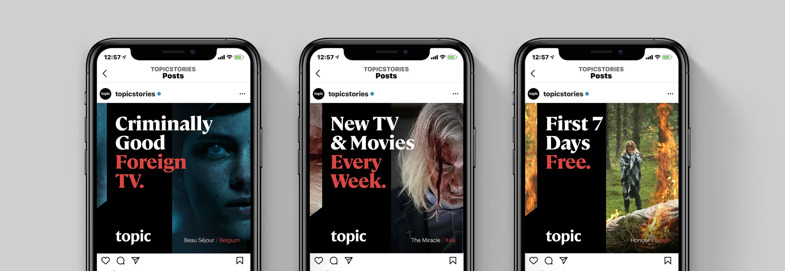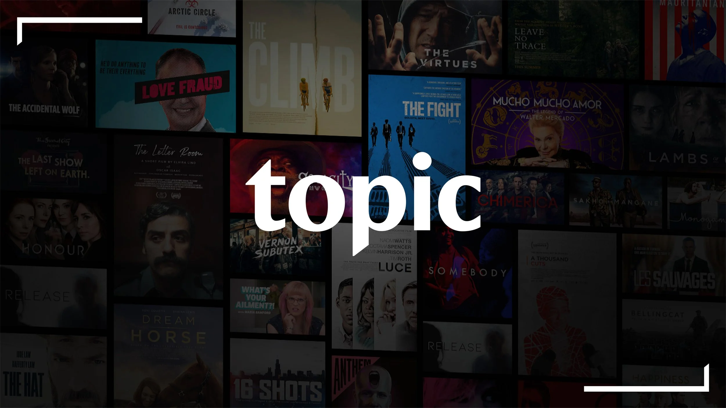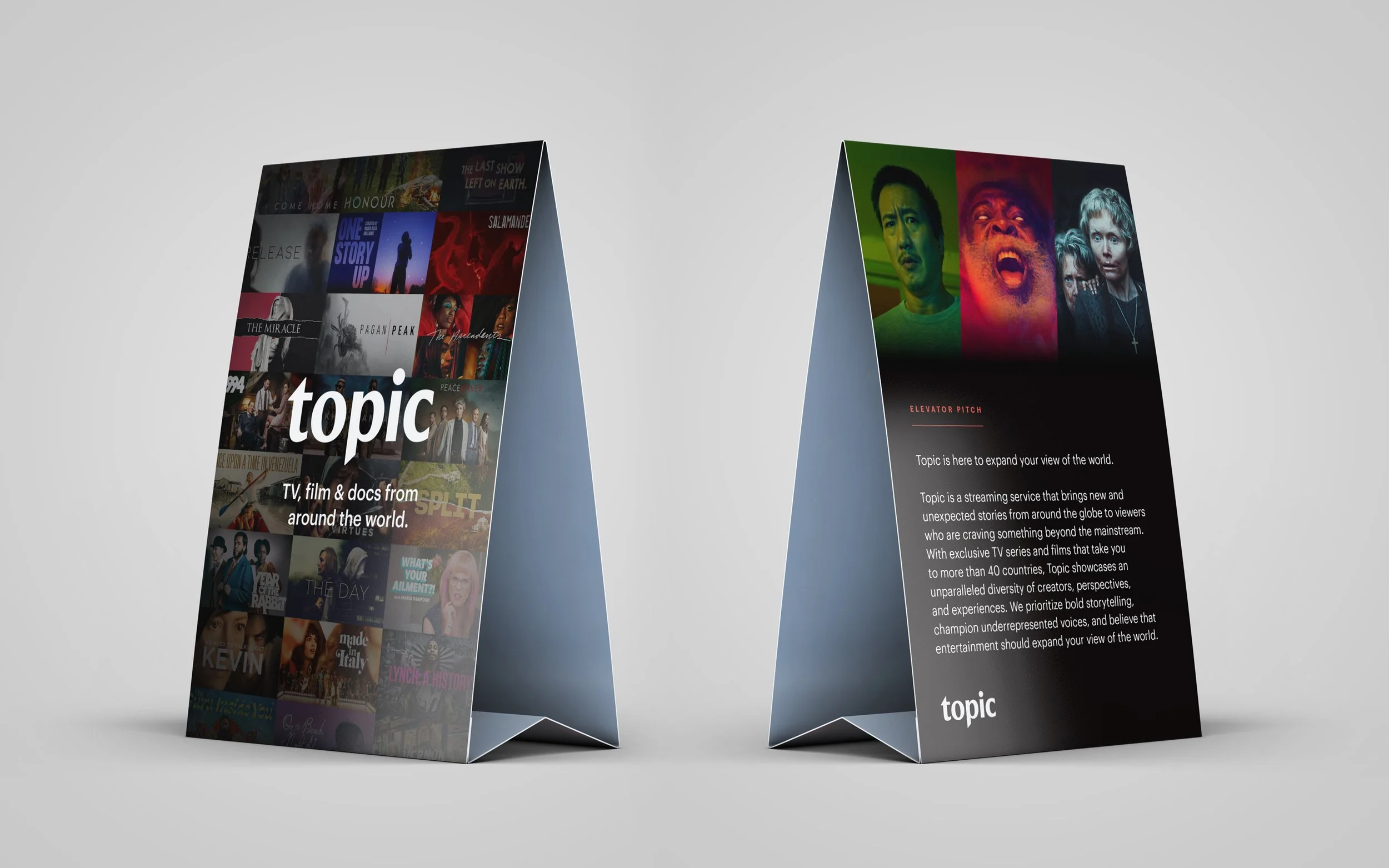 Designed for streaming service Topic since its’ initial launch. Executed and maintained consistency with brand elements such a bracket system, gridded key art, and diagonal cuts. Work included social ads, various platform assets, decks, printed pieces, and much more.